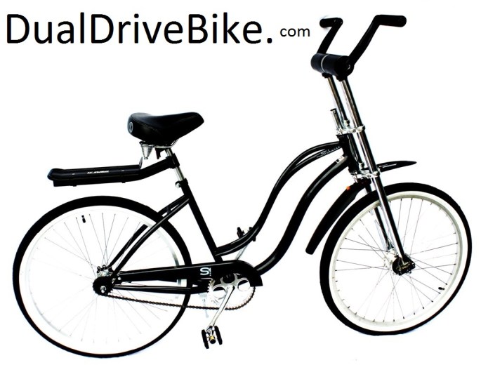 As you can see, “No Chains” on the front wheel drive! I’ve run the drive shaft down inside the right side dual crown front fork and attached the unit to an inexpensive girls’ Bojon Beach Cruiser. I will attach it to several different styles of bicycles and post the pictures as they happen. The hand driven front wheel drive will fit the head tube of any bicycle! The possibilities are limitless! I am probably 6 months away from full scale production. I sent in my “Shark Tank” application…lol
